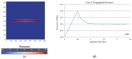 where is the critical pressure, is the fracture propagation pressure, and is the plane strain: Young’s modulus. The estimated maximum fracture propagation pressure from Equations (31) and (32) is 20.138 MPa, which is slightly lower than the simulated pressure of 20.198 MPa, and the final propagation fracture length is 248 m. Once the fracture propagates at approximately 0.5 h, the injection pressure starts to decline (Figure 8d).