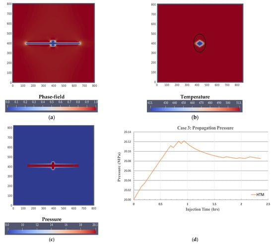 The second result is related to thermal effects. To demonstrate the significant influence of temperature on fracture propagation, it is important to create a cooling area along the initial crack. The presence of a cooling area (Figure 8b) can lead to secondary fractures opening (Figure 8a) in directions perpendicular to the main fractures. The presence of a cooling area can lower the critical pressure required to induce fractures during cold-water injection, which is due to the influence of temperature changes on the thermal strain. This effect was proportional to the temperature change (ΔT) and the coefficient of thermal expansion (α) of the rock. The cooling region caused the injection water pressure to reach the propagation pressure (), and the fracture propagation was lower than in case 2 without considering the temperature at 0.7 h (Figure 11a). Considering the thermal effect, the length of the main crack became shorter. This was because the secondary fracture formed perpendicular to the direction of the initial crack, requiring an additional water injection to fill it (Figure 11b). According to Perkins and Gonzalez [41], injecting lower-temperature fluid into a reservoir gradually forms a cooling area around the well (Figure 8b). The effective stress ) around the cooling area was corrected because of the additional effect of thermal strain . The relationship between the effective stress and the total stress ) in the porous media (Equation (10)) resulted in a decrease in the temperature leading to total stress reduction (Figure 11). This was the result of plotting the injection pressure at the wellbore during the simulation. The influence of changes in the water viscosity and density caused a significant pressure difference (∆p) between the pressure at the wellbore and the fracture tip. The final fracture propagation lengths of case 2 (HM) and case 3 (HTM) were 248 m and 240 m, respectively. In case 2, the fracture tip pressure was 20.19 MPa, while in case 3, it was 20.12 MPa. Therefore, case 3 had a lower hydraulic fracture than case 2. This result showed that the temperature had a significant impact on improving the fracture propagation.