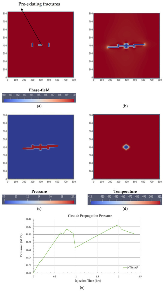 This study investigated the interaction between pre-existing (i.e., natural) fractures and hydraulic fractures. It was assumed that the two natural fractures were oriented in a north–south direction, as shown in Figure 10a. An injection well was drilled between the two natural fractures, and the distance between the natural fracture and the well was 96 m. Other rocks and fluid properties were the same as in the previous cases. The fracture propagation was symmetrical toward the x-axis (x+ and x−). When the hydraulic fracture hit the natural fractures, the hydraulic fracture branched to the natural fractures, as shown in Figure 10b. Figure 10c,d show the pressure and temperature distributions in the formation, respectively. As shown in Figure 10e, the maximum injection pressure was 20.114 MPa, and the final propagation fracture was 168 m, which is lower than in case 3.