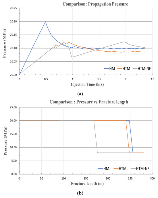(a) Comparison of the propagation pressures. (b) Comparison of pressure and fracture length.