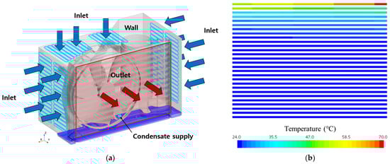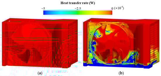 Figure 15 shows the distribution of the heat-transfer rate on the surfaces of the shroud, the slinger ring, and the fan for the single-phase flow of the air and the multiphase flow with the air and the condensate. The thermal boundary conditions on the walls of the single-phase flow with the air had the same isothermal condition as the inlet condition, except for the condenser coils. Thus, there was almost no heat transfer on the walls, except for the condenser coils, leading to the zero value of the heat transfer, as shown in Figure 15a.