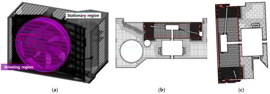 The WAC is basically composed of an evaporator, a compressor, a condenser, and a capillary tube. The evaporator blower and the condenser fan are operated by the same single motor mounted on a single axis shaft. The slinger ring is mounted on the fin tips. The WAC is divided into indoor and outdoor units, as shown in Figure 1a. The present study focused on the effect of the slinger ring on the flow and heat transfer in a WAC. Thus, the present study considered an outdoor unit and the external multiphase flow. The present computational model is presented in Figure 1b. The specifications of the components for the computational model in Figure 1b are presented in Table 2.
