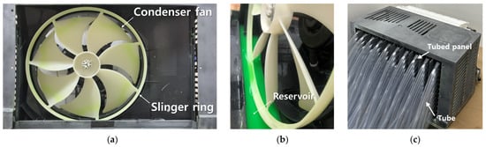 Two experiments were separately performed. One was to measure the amount of the condensate in each tube, as shown in Figure 5c, to achieve the distribution of the discharged condensate on the inner plane near the condenser coils. The other was to visualize the condensate spray by the slinger ring to understand the condensate distribution on the plane near the condenser coils.
