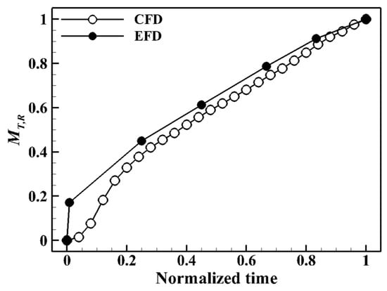 The amount of the sprayed condensate can be a possible indicator of the heat-transfer performance of the slinger ring. Thus, the present study measured the total amount of the condensate mass discharge crossing the measurement section near the condenser. The present numerical study followed the same strategy of the experiment to measure the total amount of the condensate mass discharge by the slinger ring. Thus, the present study focused on a comparison of the patterns of the time evolution of the total condensate mass discharge between the EFDs and the CFDs. First, in case of the EFDs, the total condensate mass discharge () was evaluated by the summation of the condensate in all the tubes. For the CFDs, the was obtained by the surface integration of the local condensate mass discharge. Next, the values of for the EFDs and the CFDs were nondimensionalized by the amount of at the longest time periods in the present experimental and numerical studies, respectively. In other words, the ratio of to the maximum was considered and denoted as the mass discharge ratio (). The normalized times for EFDs and CFDs were achieved by each of the end times.