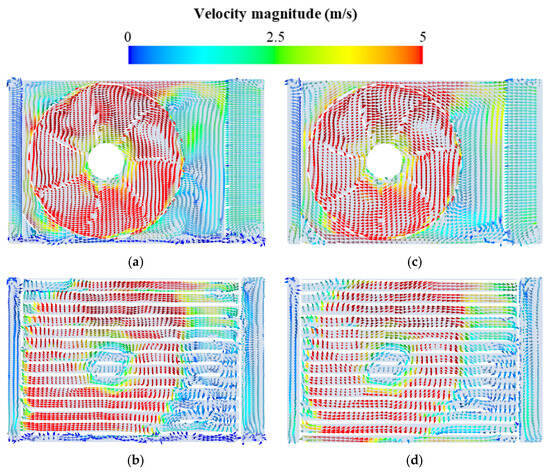 Velocity vectors colored with the velocity magnitudes for (a,b) the multiphase flow and (c,d) the single-phase flow in different axial planes of centers of the fan (a,c) and condenser coils (b,d).