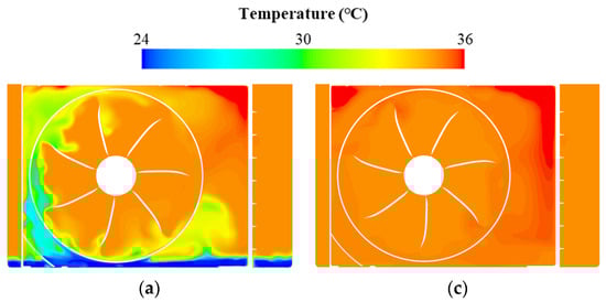 As the plane was closer to the condenser coils, the region of the low-temperature distribution became smaller because of the reduction in the distributed area and the amount of the sprayed condensate with the low temperature, as shown in Figure 11b. Some condensate sprayed by the slinger ring reached the condenser coils, as shown in Figure 8b, which contributed to the enhancement of the heat transfer by the reduction of the temperature of the coils, as shown in Figure 11b. As the plane became more distant from the fan center, the velocity vectors in the right side between the slinger ring and the shroud wall were more unstable and formed the complex secondary vortical flow, as shown in Figure 10b. Thus, the mixing effect contributed to enhancing the cooling in this region, resulting in the temperature drop in this right-side region, as shown in Figure 11a,b.