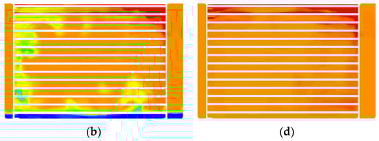 The isothermal conditions with different temperatures were applied on the condenser coils. The condenser coils with higher temperatures than the inlet temperature of the air are located over the dashed line marked in Figure 16. Thus, the hot condenser coils were cooled by the heat loss to the air, resulting in the appearance of negative heat-transfer rates on the condenser coils over the dashed line, as shown in Figure 16a. This heat transfer was expected by the difference in the boundary conditions.