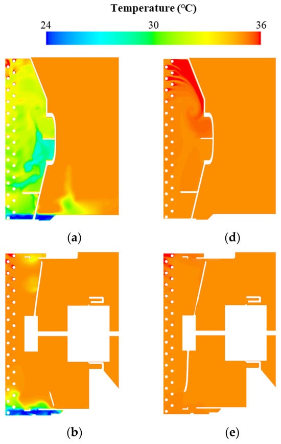 The low-temperature distribution was concentrated near the left-side wall and the gap between the slinger ring and the left-side wall, as shown in Figure 11a,b. The low-temperature distribution was naturally governed by the distribution of the splashed cold condensate.