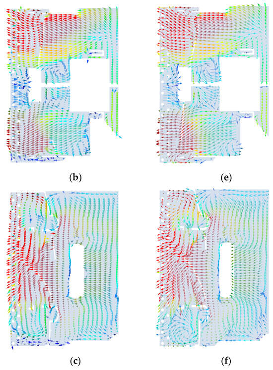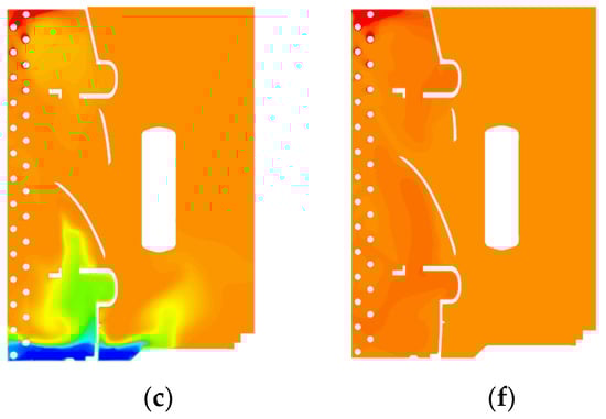 The right-side plane was partially covered with the splashed condensates by the centrifugal force of the slinger ring, as shown in Figure 12c. As shown in the axial plane in Figure 10, the fan center plane was affected by the strong axial flow shown in Figure 14b,e restricting the entrainment of the spayed condensates and resulting in a negligible cooling effect, with about the same isothermal distribution as that with the single-phase flow, as shown in Figure 13c,f for the multiphase and single-phase flows, respectively.