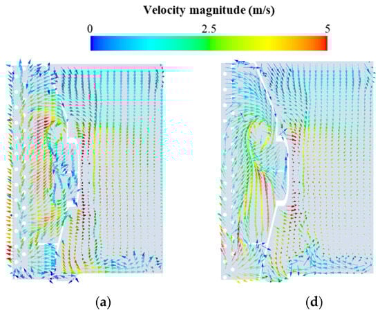 The reverse flows occurred in the regions near the top and side walls, as shown in Figure 14a,c. These circulating flows carried hot fluids attached to the upper hot coils in the inner region and increased the inner fluid temperature. Therefore, the upper region near the top wall was covered by hot temperatures, as shown in Figure 13.