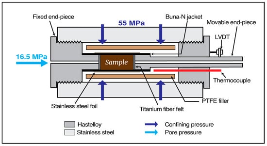 Schematic drawing of hydrostatic pressure vessel in creep/flow-through apparatus. Compared to the pressure vessel in flow-through apparatus, the hydrostatic pressure vessel has an additional linear variable differential transformer (LVDT) for measuring axial displacement from changing the confining pressure. Reprinted with permission from SSRN [].