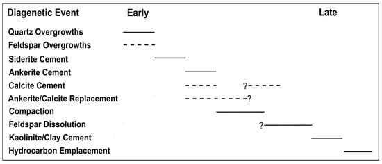 For the Morrow B sandstone, the events from early to late diagenesis include quartz overgrowths, feldspar overgrowths, siderite cementation, ankerite and calcite cementation/replacement, compaction, some calcite cementation, feldspar dissolution, clay cementation, and hydrocarbon emplacement (Figure 3). The paragenetic sequence was determined by observing the micrograph evidence of mineral textures (Table 4). Note that the timings of feldspar overgrowth with quartz overgrowth and ankerite and calcite cement are ambiguous. Ankerite and calcite replacement and compaction events can be overlapped in some locations within the formation.