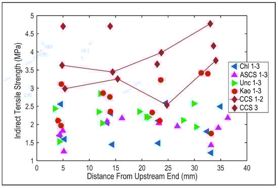 Indirect tensile strength of fifteen post-experimental samples as a function of the distance from the upstream end. Note that CO2-treated samples CCS1-2 show a prominent decrease in strength towards the upstream end of the sample, while all other sample show negligible differences in tensile strength across the sample length.