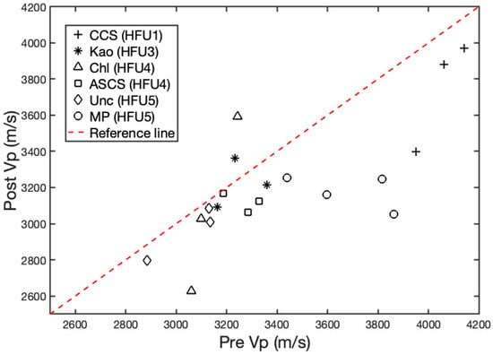 Post-test vs. pre-test P-wave velocity. In most samples, the pre-test P-wave velocity is slightly higher than or similar to the post-test P-wave velocity, except for two samples (Chl1 and Kao1).