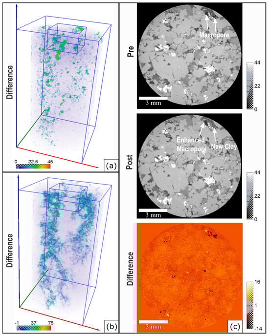 (a,b) The 3D rendering of the pre- and post-test difference with 27 μm resolution in samples Chl1 (a) and Cal/Kao2 (b) showing minor dissolution with unconnected porosity in Chl1 and significant dissolution with connected porosity in Cal/Kao2. The color scale bar is a quantitative representation of the pre- and post-test difference. (c) Pre- and post-test data, and the subtraction of the post-test from the pre-test values of 11 µm resolution images for a slice of sample Unc3 showing clay migration and/or precipitation at multiple locations. The color scalebar indicates change reliability where positive is dissolution (white) and negative is precipitation or movement of clays (dark browns). Black is the most negative and generally represents an artifact in imaging and post-processing of the brightest phase. Reproduced with permission from [].