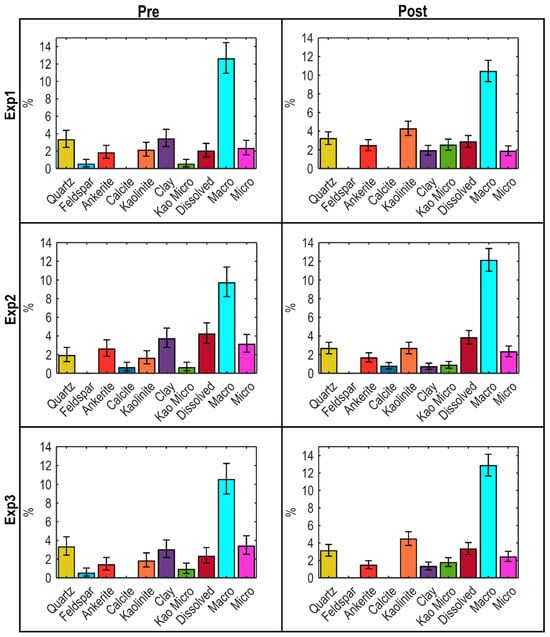 A thorough petrographic analysis including 1000 (pre) and 2000 (post) point counts was performed on samples MP1-4 of the macroporous-dominated lithofacies studied in [] to verify the volumetric estimates of framework grains, cement, and porosity and to document changes in the mineralogical textures and formation damage (microfracturing) from fluid–rock interactions during testing. The point count analysis indicated that, on average, these samples from the macroporous-dominated lithofacies of the Morrow B sandstone had 70% framework minerals, 10% cement, and 17% porosity. The cement minerals were composed of 3% quartz overgrowths, 1% ankerite, 2% kaolinite, and 3% undifferentiated clay. The porosity consisted of 11% macroporosity, 3% dissolution porosity, 3% undifferentiated clay and kaolinite microporosity, and 1% other microporosity. The samples also contained 1% ankerite replacement and 2% matrix (Figure 7). All samples contained trace quantities of calcite in the pre-test thin sections; however, only MP2 had enough to constitute 1% volumetrically (Figure 7). The uncertainty ranged from ±0.10 to ±1.9% for all phases (Figure 7).