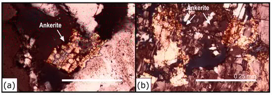 Alteration of ankerite occurs frequently in tests performed with a CO2-rich fluid, as indicated by deterioration of its crystal structure. (a) MP1, which also sometimes displays new coatings of iron oxide; (b) MP4.