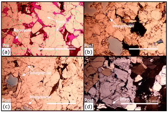 The pre-test thin sections indicated that all samples of the macroporous-dominated lithofacies studied in [] were fractured to some extent during burial. Deformation was the most extensive in the sample MP3 and was less apparent in samples MP1-2. The microfractures were typically intragranular, with a low intensity and thin aperture and porosity can be visualized within them (Figure 9a). Macroporosity was common around low intergranular volume (IGV) areas where grains were fractured (Figure 9a). Damage was the most abundant in the thin section from MP2, which was performed only with reservoir brackish solution. The deformed zones had a high fracture intensity with numerous events occurring within individual framework grains (Figure 9b–d). The offset of fractured pieces of individual grains often occurred (Figure 9d). Intergranular fracturing was sometimes apparent (Figure 9c), and grain consolidation seemed to have occurred in severely damaged zones indicated by a loss of macroporosity (Figure 9b,c). The other experiments typically had scattered instances of microfractures, which likely occurred during testing. However, because no large zones of deformation existed in those thin sections, this attribution remains uncertain.