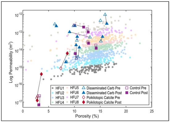 Change in porosity-permeability correlation or HFU of all 19 samples from flow-through and creep/flow-through experiments. CO2-reacted samples with disseminate carbonate (Disseminated Carb) include ten samples, CO2-reacted samples with poikilotopic calcite (Poikilotopic Calcite) include three samples, and control samples (Control) include six samples. Pre-test results are hollow markers and post-test results are solid markers. Note large deviations of permeability and porosity in some samples of Poikilotopic Calcite (red rhombi) and Disseminated Carb (blue triangles).