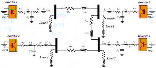 The four-DG model from the reference was used in this paper. It includes droop controllers, voltage and current control models, LC filters, and coupled inductors. A full-system model was considered to comprehensively analyze stability factors within the system. Unlike previous models that neglected inverter gains, they were considered in this model to enhance model accuracy [].