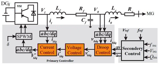 However, a sudden disconnection of the grid power source would collapse the MG system because balance is absent in load and generation power, affecting the frequency and voltage control. VSIs’ capability to establish voltage and frequency references enabled MGs to operate in autonomous mode without any communication or mode control requirements. This is possible due to the VSI’s ability to operate and coordinate in parallel with other voltage sources alongside other VSIs during autonomous operation. Using reference voltage and frequency to control VSIs [], DGs can be put under a primary control to spread the load demand among several DGs in a way that is proportional to their ratings. VSIs are mostly controlled by the Sinusoidal Pulse Width Modulation (SPWM) switching technique, controlled by primary controller signals as shown in Figure 2.