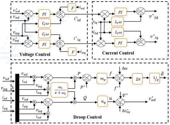 where , , and represent nominal set-points for frequency, voltage, and active power, while the nominal value for reactive power is considered zero. The calculation of reactive and active power relies on the measured voltage and current represented the by d–q reference frame, denoted by , , , and . To ensure high-quality power delivery, the average power is obtained through the utilization of a low-pass impedance filter featuring a cut-off frequency of :