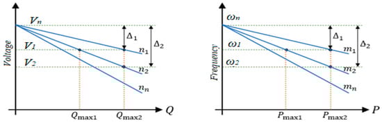 Therefore, droop coefficients are essential to ensure optimal power sharing. Thus, updating them enhances the response and adaptability to confront various transient disturbances. The advantage of droop control is that it enables power sharing without necessitating a communication link, thereby conferring flexibility and autonomy []. As shown in Figure 4, the droop curves demonstrate the deviation after each disturbance.