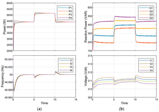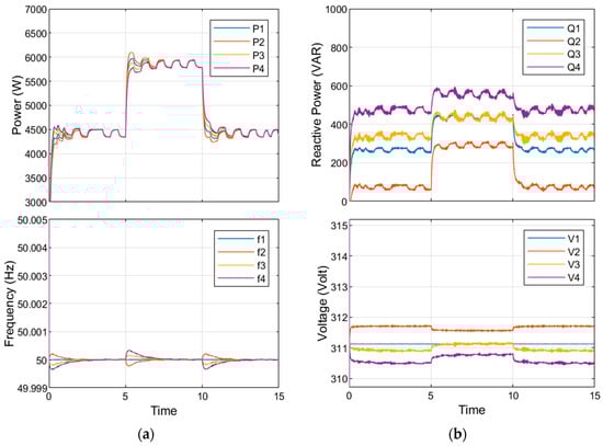 This section presents, in Figure 7 and Figure 8, a recent PSO-optimized droop with a model predictive control approach and the proposed CF-GSA-optimized droop, respectively. In (a) figures, the active power sharing regulates the frequency, while (b) figures demonstrate the reactive power sharing regulating voltage. Initially, the radial MG connection operates under inductive loads 1, 2, and 3, while load 2 is off. At a time of 5 to 10 s, load 2 is attached to the system to examine MG performance under additional critical inductive load changes.