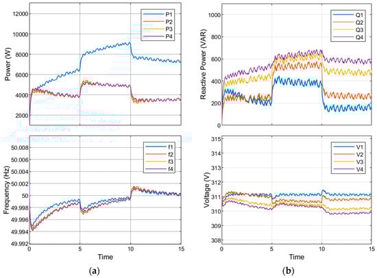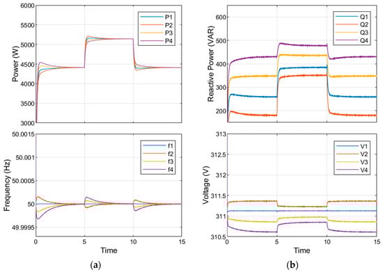 MG power sharing performance under a PSO improved power sharing []: (a) Power–frequency response; (b) Reactive power–voltage response.