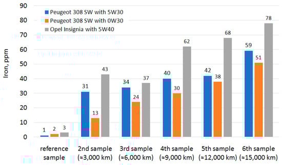 Figure 1), which can be explained both by the mutual friction of engine assemblies and the washing of engine oil against iron and steel parts, as well as the release of iron oxide under the influence of acids. The presence of iron particles is considered a normal phenomenon since it is impossible to completely exclude the occurrence of friction in the engine assemblies. Although the iron level is increasing, it does not reach the critical or threshold values for any car. At the same time, a reduction of iron particles for Opel Insignia was observed at 6000 km, explaining it with sediment of these particles in the oil filter. With the increase in mileage, not all of those particles can be absorbed inside the filter.