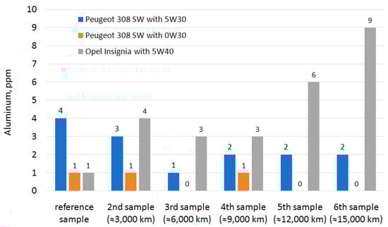 Figure 2) for the Peugeot 308 SW made by PSA Group in Sochaux (France) remained at the same low level both with SAE 5W30 and SAE 0W30 engine oil, whereas for the Opel Insignia made by General Motors in Rüsselsheim (Germany), a rapid increase in aluminum particles was observed after 9000 km of mileage. Aluminum particles can be released when engine oil is flushed into the aluminum piping or crankcase cover, as well as in the oil cooling heat exchanger, or as a result of friction between the oil pump housing and the pump wheel. However, it should be noted that a content of 9 ppm aluminum in engine oil is still a relatively low value that does not indicate a significant intensification of wear processes.