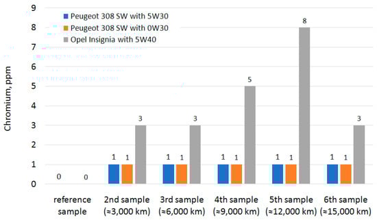 Figure 3) in the engine oil at higher mileage, which may occur as a result of friction between the cylinder and the compression rings. Chromium observed in the case of the Peugeot 308 SW may have been released by engine oil washing against the stainless steel pipes, as there was no evidence of damage to this car. For Peugeot 308 SW, both with SAE 5W30 and SAE 0W30 engine oils, the chromium level remains consistently low throughout the entire oil change interval and does not reach the limit values, concluding that no significant release of chromium is observed as a result of wear. For Opel Insignia, the level of chromium particles was moderately high throughout the oil change interval and reached its maximum value at 12,000 km. Chromium is used in the manufacture of piston ring coatings, which is most likely the cause of the presence of chromium particles in these samples. As the piston rings rub against the cylinder walls, chromium particles could enter the engine oil.