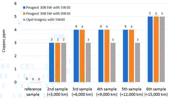 Figure 5) was observed in all the cars used in the test. Release of copper particles is possible when valve stems rub against valve guides made of copper alloy—bronze; as well as a result of friction occurring in bronze bushings. In none of the cars does the amount of copper particles reach high values, which indicate typical, normal wear of parts as a result of friction.