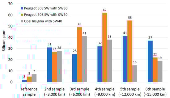 Figure 9, the silicon concentration for the Peugeot 308 SW with SAE 0W30 engine oil reached a critical limit at 9000 km mileage, but then the silicon level decreased again. Considering the construction of the wet timing belt used in this car (similar to the drive chain, the timing belt is inside the engine block, in a constant bath of engine oil), the presence of silicon could also be explained by the flushing of the engine oil against the timing belt. On the Opel Insignia, shortly before the start of the experiment, engine repairs were carried out, which resulted in an increased presence of silicon particles in the engine oil samples. Since the construction of both cars is carried out in such a way that the crankcase cover is screwed to the engine block and silicone sealant is used as a sealing element between these surfaces, the presence of these particles could also be explained by the washing of engine oil against the used silicone sealant.