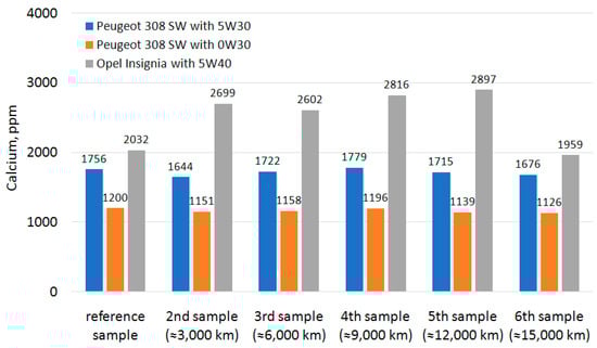 As a rule, magnesium, calcium, and barium are added to engine oils as flushing additives, the task of which is to clean the lubrication system from oil sludge and prevent the formation of ash deposits in the oil. Based on the results obtained in the test, it is possible to determine that only SAE 0W30 engine oil used in the Peugeot 308 SW had a barium additive added, and this additive was not detected in the other engine oil samples. The magnesium level for all cars remained at a steady level, except the Peugeot 308 SW with SAE 5W30, which showed a sharper decrease between 3000 and 6000 km. Despite this jump, the data obtained during the analyses did not indicate any damage or excessive development of barium and magnesium additives. This study found that a stable amount of calcium additives (