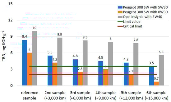 For the Opel Insignia, between 12,000 and 15,000 km of mileage, a sharper reduction in TBN was observed, which indicates the end of the engine oil’s working life. For a Peugeot 308 SW with SAE 5W30 engine oil, the TBN reached the limit at 15,000 km. Using SAE 0W30 engine oil, TBN fluctuated around the threshold value from 6000 to 12,000 km, after which the total number of bases decreased sharply, and at a mileage of 15,000 km, it already reached a critically low value.