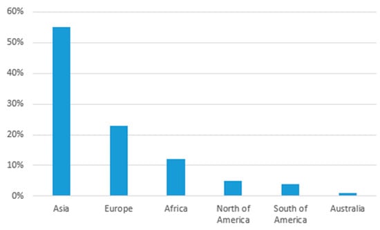 Most studies on dust accumulation and soiling effect on solar panels primarily originate from Asia, as shown in Figure 3. Saudi Arabia is the country with the highest number of research and studies on the soiling effect on solar panels worldwide []. There are two main reasons that can explain the dominance of Asia in studies on dust accumulation on solar panel surfaces. Firstly, Asia accounts for a significant portion of new solar installations, representing approximately 60% of all new solar installations worldwide []. Secondly, there are vast arid and semi-arid regions in Asia []; Asia is considered one of the driest, windiest, and dustiest environments in the world, where the interaction of dust with clouds has a significant impact on the regional climate of Asia. Africa is considered one of the regions with the highest sand and dust accumulation on Earth [].
