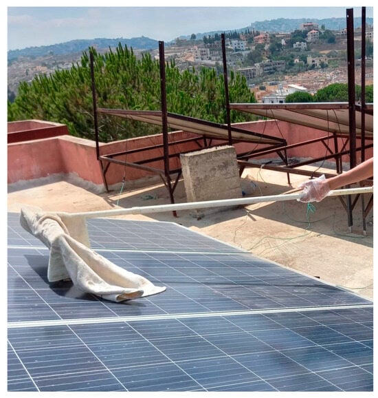 This generally involves the intervention of professionals, as it can be hazardous and requires proper equipment. However, this method may have little to no impact on the annual performance of the panels unless performed regularly []. Manual cleaning tools are associated with high costs due to the significant amount of water used and the required workforce []. The workforce involved is primarily unskilled, which could lead to damage to the solar panels. Additionally, skilled workers may carry out inspections simultaneously, further increasing labor costs []. A visual illustration of this method can be seen in Figure 4, depicting a professional engaged in manually cleaning solar panels.