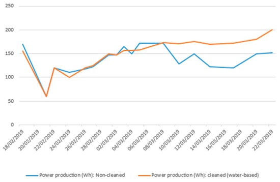The water cleaning protocol was established with a 30 s wetting sequence for each module equipped with water jets. The results clearly demonstrated a significant improvement in the output power of the water-cleaned panel arrays compared with the uncleaned reference arrays. The average power of the cleaned arrays was 177 W, while that of the uncleaned arrays was 140 W, indicating an average increase of around 27% in power for the cleaned arrays (See Figure 6) [].