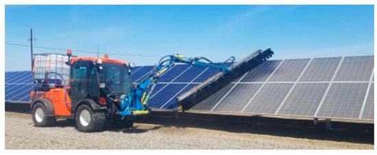 Cleaning truck-mounted solar panels, as illustrated in Figure 7, is a widely used method for maintaining large solar installations. This system involves the use of a truck or another vehicle equipped with a specially designed brush for cleaning solar panels. The truck moves between rows of photovoltaic modules, effectively cleaning each panel.