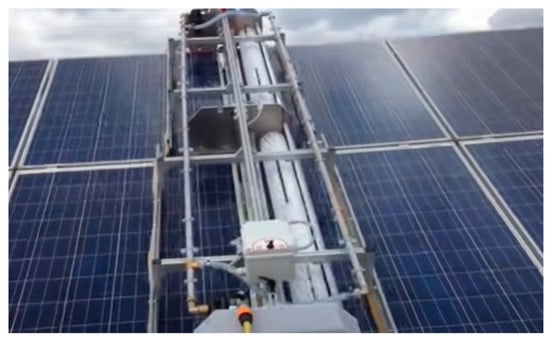 This robot is designed to clean rows of photovoltaic panels by horizontally moving a vertical brush across the panels, as shown in Figure 8. It has a length ranging from 1 to 16 m and is equipped with a 12 V battery, allowing it to be automatically deployed. Additionally, a water hose is attached to the robot to wet the panels during cleaning. The Wash Panel system is fully autonomous and has dual programmable functionality using a rain sensor and the use of water jets. It ensures consistent and uniform cleaning. This system is modular and can be remotely monitored and managed. It requires no additional framework, support, or additional guides. It can be installed on ground systems, buildings, sloping roofs, or canopies. For continuous monitoring, it sends text messages to mobile phones, enabling remote control from distant locations [].