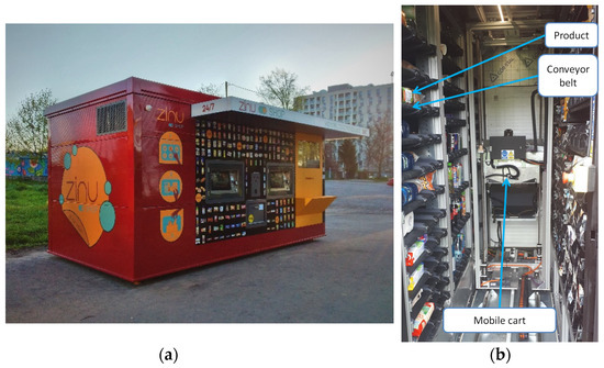 The automated store developed by the company Delfin sp. z. o. o. (Nowa Wies, Poland) has the form of a container of dimensions of 3 × 3 × 6 m (height, length, and width), as shown in Figure 1a.