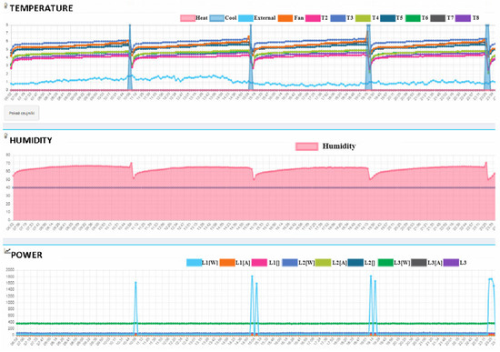 The proper operation of the store is provided by a supervising system operating in an online mode, as shown in Figure 2. The system is responsible for monitoring basic operational parameters, such as internal temperature for eight measurement points, external temperature, humidity inside the store, the activation of the heating and cooling unit, current and power intensity for three measurement points.