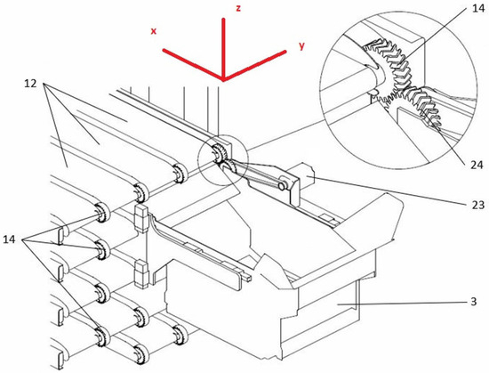 Schematic view of the automated retail kiosk’s inner mechanisms: mobile cart and conveyor belts. The gears (14 and 24) were mounted on a mobile cart (3), establishing the link between the shaft of the AC servomotor (23) on one side and a conveyor belt’s passive shaft (12) on the other.