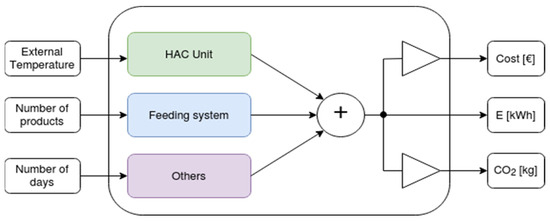 Project assumptions regarding the minimum number of types of data sets necessary to estimate the energy consumption, CO2 emission and costs over the assumed average operating period of one month (approximately 30 days) resulted in the final choice of the model description for the HAC unit based on the lumped method heat capacity, and a linear relationship between the energy consumption coefficient per product for the feeding system.