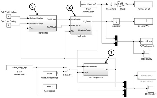 Electrical energy consumption model of the air conditioning system in the considered automated store implemented in the MATLAB/Simulink environment: thermal model of the store container (1), thermal model of the cooling and heating (HAC) unit (2), and thermostat model (3).