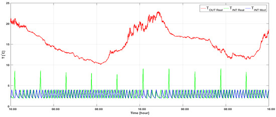The first experiments on the HAC unit model concerned the identification of the model parameters. The model input includes a set of measured outdoor temperature values (Figure 6, TOUT Real) obtained from the automated store monitoring system (Section 2.1).