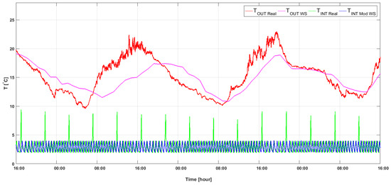 Time histories for 72 h: TOUT_WS—measured external temperature, TOUT_WS—external temperature registered by the meteorological station, TINT_Real—temperature measured inside the store, TINT_Mod WS—temperature inside the store estimated from the assumed model on the basis of the data from the meteorological station.