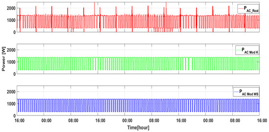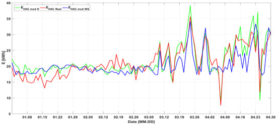 The last step of model validation consisted of a comparison of the measured and estimated energy consumption of the HAC unit. A comparison of time histories of the HAC unit’s electrical power, measured (PAC_Real) and estimated for the assumed model (PAC Mod K), is presented in Figure 8.