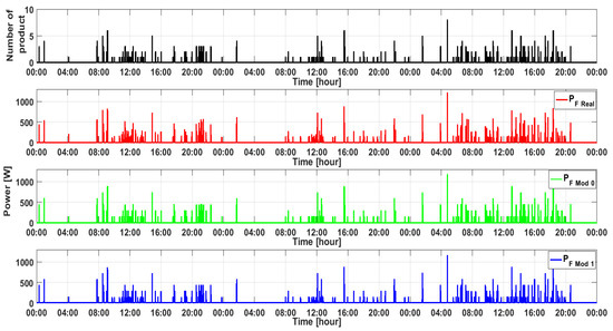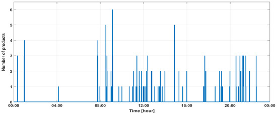 Over the course of the carried-out test, the first model was denoted by Mod 0. The value of the energy consumption coefficient per product was determined on the basis of measurements of the number of products (Figure 9) and power (Figure 10) carried out by the store’s monitoring system in a 24 h period. In total, 151 products were collected.